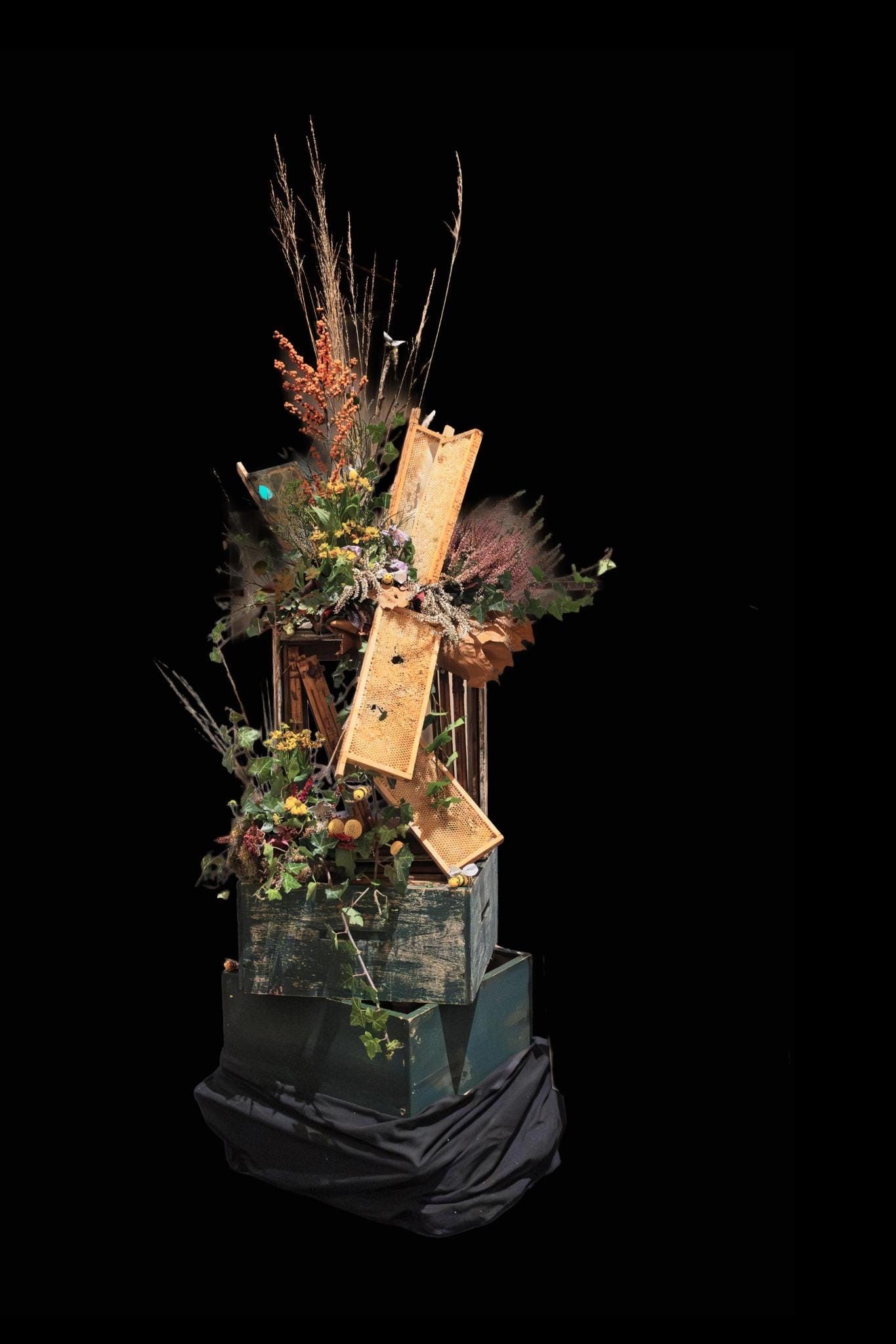 Liturgische schikking Pinksteren Thema: Vuur, wind en verbinding In het stuk zien we rode pepers en vuurpijlen die het vuur van Pinksteren verbeelden. De rode pinnen strekken zich uit naar alle windstreken. De kleuren van het vuur; rood en oranje ziet u in het stuk. De hedera die verwerkt is, staat voor de verbinding tussen God en de mensen.