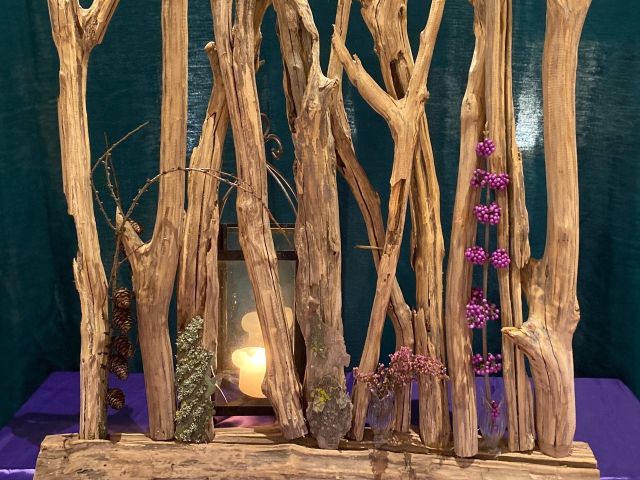 Thema: Jesaja brengt het licht Voorwerp geluksbezorger: Lantaarn. Geen mens zal meer weten wat oorlog is. Nakomelingen van Jakob, kom mee, Laten we leven in het licht van de Heer. De schikking van de eerste advent komt vanuit het donker; in de houten standaard zien we schors, dennenappels en dode hei. De kleur van advent ziet u in de paarse bessen. Maar het licht staat al achter de standaard. |